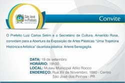 A Prefeitura Municipal de São José dos Pinhais, por meio da Secretaria de Cultura apresenta a exposição “Uma Trajetória Histórica e Artística” da artista plástica Arlene Senegaglia.  A bertura da exposição acontecerá no dia 19 de Setembro, às 18h30, mesmo dia em que o museu municipal comemora 36 anos.  O Museu Atílio Rocco foi idealizado pelo historiador sãojoseense, Ernani Zetola e apoio do Lions Clube Aeroporto e Prefeitura Municipal com o objetivo de resgatar e enfatizar a memória histórica de São José dos Pinhais.