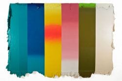 Fernando Burjato trata de uma imagem sem figuras. Seu trabalho se constrói pela borda, acumula tinta como se buscasse sair para além dos limites da tela. As cores justapostas não se misturam, e o acúmulo de matéria fica pelas bordas, dando corpo à imagem, às listras.