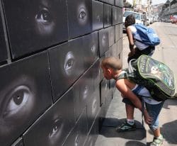 Construído com 80 blocos, “O MURO” guarda no interior os olhares das crianças (fotos), mas seus olhos estarão fotografados do lado de fora, com o intuito de humanizar ainda mais a instalação e instigar a curiosidade das pessoas de olhar através de um buraco (feito na íris) e descobrir o que há do outro lado.