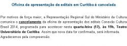 A Fundação Cultural de Curitiba comunica que a Oficina de Apresentação de Editais que seria realizada no dia 17/09/2014 foi CANCELADA !